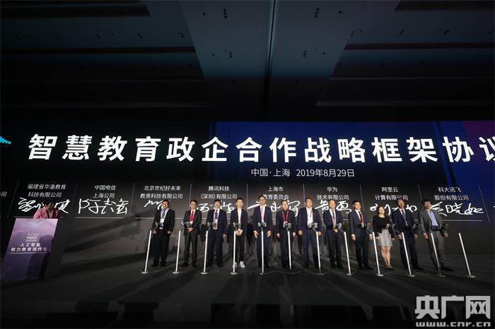 智慧教育政企合作战略框架协议签署(央广网发 顾超 何思哲 谈乐达 摄) 央广网上海8月29日消息(记者吴善阳)2019世界人工智能大会今天在上海开幕。下午,主题为“人工智能助力教育现代化”的教育行业主题论坛举行,这是教育主题首次亮相世界人工智能大会
